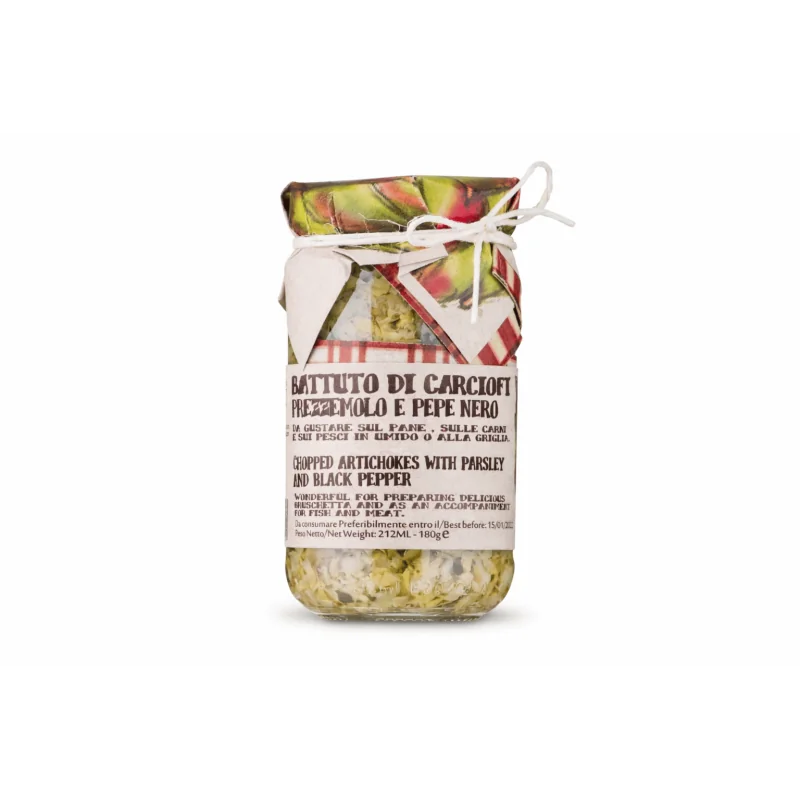 INGREDIENTI: Carciofi 75%, olio di semi di girasole, olio extra vergine di oliva, aceto di vino, prezzemolo 0.2%. pepe nero 0.2%. aglio, sale.